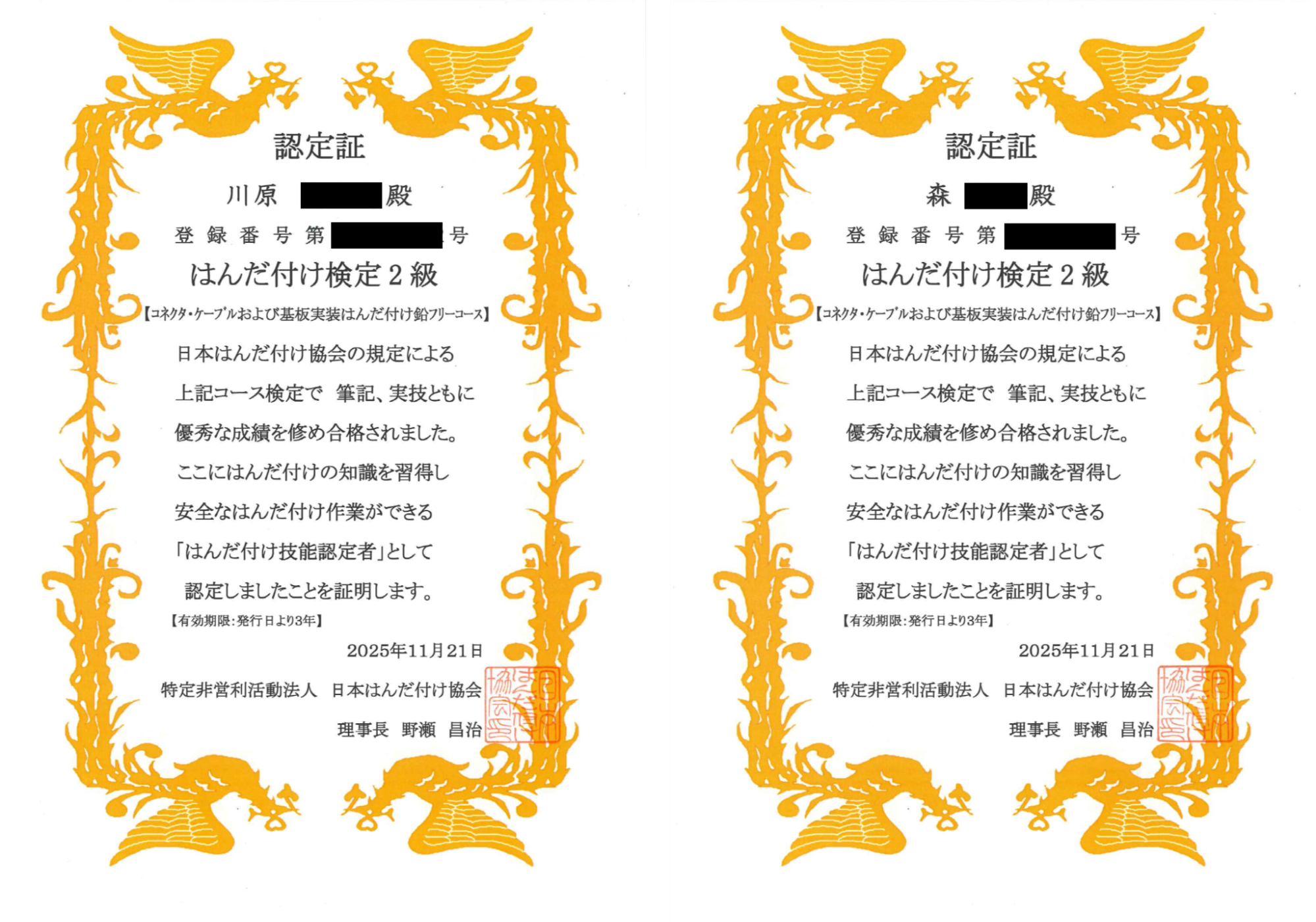 2025年12月9日特定非営利活動法人 日本はんだ付け協会 が主催する「はんだ付け検定2級」に当社社員2名が合格しました。