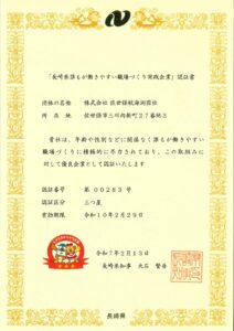 タイトル:長崎県 誰もが働きやすい職場づくり実践企業認証制度『Nぴか』認定取得しました。