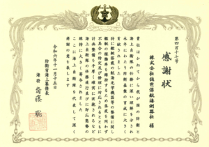 令和6年11月15日(金) ホテルグランドヒル市ヶ谷にて令和6年度自衛隊記念日における感謝状を防衛省 海上幕僚長より頂戴いたしました。 これからも社業を通じ社会に貢献し、艦艇の安全航行、稼働率向上に寄与して参ります。